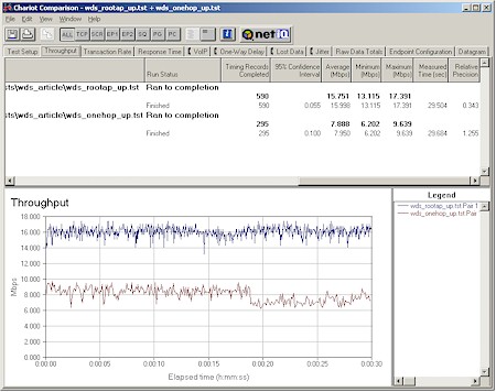 So that you can see the effect that a WDS "hop" has on wireless performance, I ran a few Chariot tests that are shown in Figure 5.
