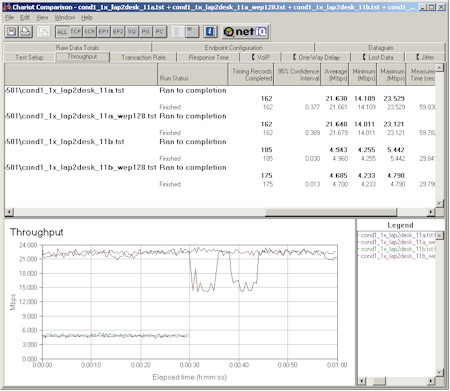 No, I didn't make a mistake and use the same plot data four times. The 501 is the only 802.11b client adapter that I've ever tested that showed such consistent (and excellent) results under all four test conditions. It just cruised along at almost 5Mbps without missing a beat. Plot 3 shows that you do get about a 4% throughput reduction when you enable WEP in 802.11b mode, however (and shows you 802.11a WEP test results, too). But the consistent throughput performance more than makes up for that small hit, and you shouldn't have any qualms about running with WEP enabled in either mode.